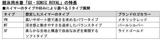 「GX・SONIC ROYAL」は、190人以上の選手からの声を反映し、前モデル※1をベースに体のサポート感とフィット感をアップさせています。高いサポート感で速さを求めるパワータイプの「PW」、浮き感と動きやすさを追求した「MT」、柔らかな構造で、軽快に自由な動きを実現するソフトタイプの「SF」の3モデルを男女それぞれにラインナップしています。