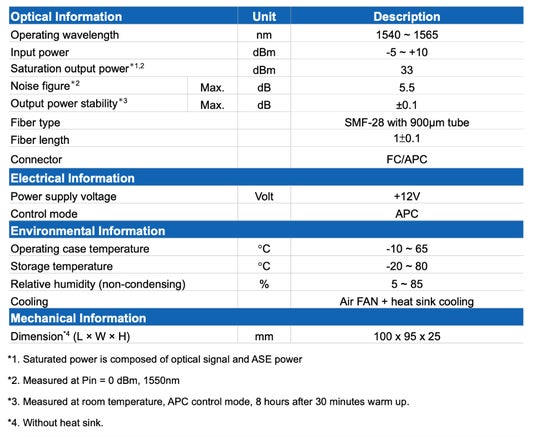 同製品は、Cバンド領域(1540~1565 nm)に対応し、シングルチャネル用途向けに設計された光増幅モ ジュールです。最大33 dBm の飽和出力を実現しつつ、最大5.5 dBの低ノイズフィギュアを維持することで、高品質な信号増幅を可能にします。