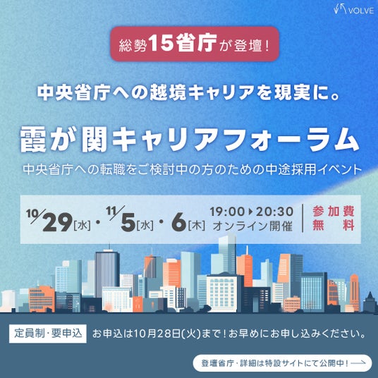 VOLVE株式会社(代表取締役CEO:吉井 弘和、本社:東京都千代田区、以下当社)は、来る10月29日・11月5日・11月6日に、15省庁が登壇する霞が関に特化した中途採用イベント「霞が関キャリアフォーラム 2025年 秋」をオンライン開催いたします。