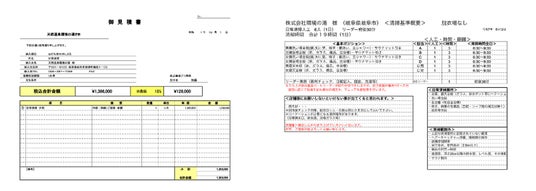 「値上げ要請があったが妥当か判断できない」「見積りを比較する時間がない」--そんな声に応える形で、経営者が冷静に判断できる“見える化された資料”を提供します。(下図:左は相見積もりでお出しする見積書の例、右は弊社がご提示する詳細な清掃基準書の例)