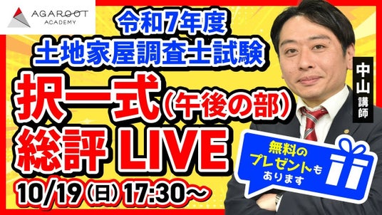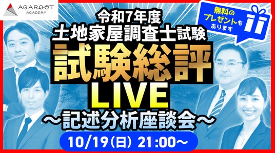 株式会社アガルート(本社:東京都新宿区、代表取締役:岩崎 北斗)が運営する「アガルートアカデミー」は、土地家屋調査士試験当日の10月19日(日)に「午前の部(択一)解答速報」「午後の部(択一)総評」YouTubeLIVE、「午後の部(記述)総評&座談会」YouTubeLIVEを無料で実施いたします。