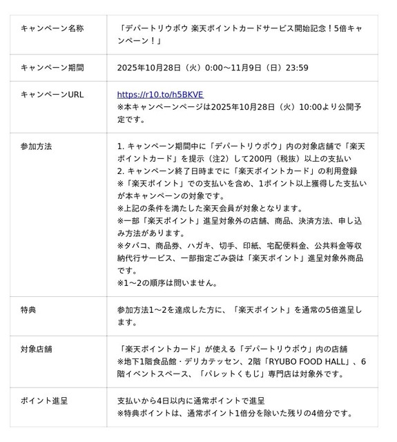 本導入を記念して、2025年10月28日(火)から11月9日(日)まで、「デパートリウボウ 楽天ポイントカードサービス開始記念!5倍キャンペーン!」を実施します。