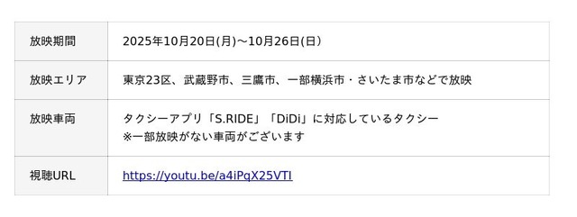 本動画は、移動時間の情報番組「HEADLIGHT」で放映され、東京23区、武蔵野市、三鷹市、一部横浜市・さいたま市など、約11,500台のタクシーでご覧いただけます。