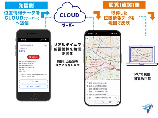 専用の機器は不要で、スマートフォンのみで利用可能。さらに受信側ではパソコンのブラウザで位置情報を確認することが出来るサービスです。