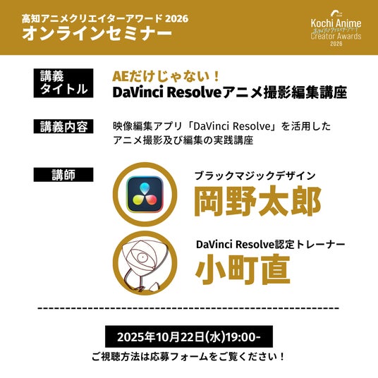 高知アニメクリエイター聖地プロジェクト実行委員会は、ブラックマジックデザイン 岡野太郎氏・DaVinci Resolve 認定トレーナー小町直氏をお招きし、2025年10月22日(水)19:00~ オンラインセミナーを開催します。