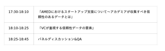 第18回MEDISOセミナーでは「信頼性データ」をテーマとして取り上げ、AMED 林様より、AMEDにおけるスタートアップ支援について、アカデミアが収集すべき信頼性のあるデータの観点からご説明いただきます。また、MEDISOサポーターであり、AMED認定VCでもおられる、Saisei Venturesの齊藤様よりVCが重視する信頼性データの要素についてご説明いただきます。