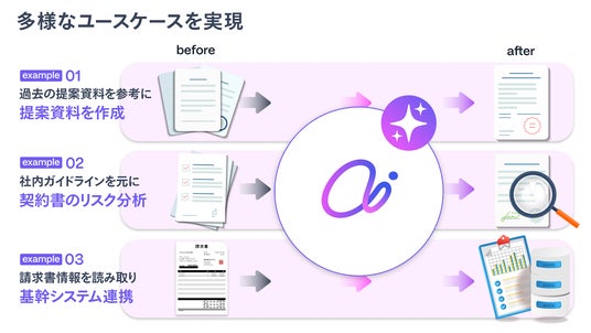 例えば、過去提案資料を参考にして提案資料を作成、社内ルール・ガイドラインを元にした契約書のリスク分析、請求書から情報を読み取って基幹システムに連携、といった多様なユースケースが実現できます。