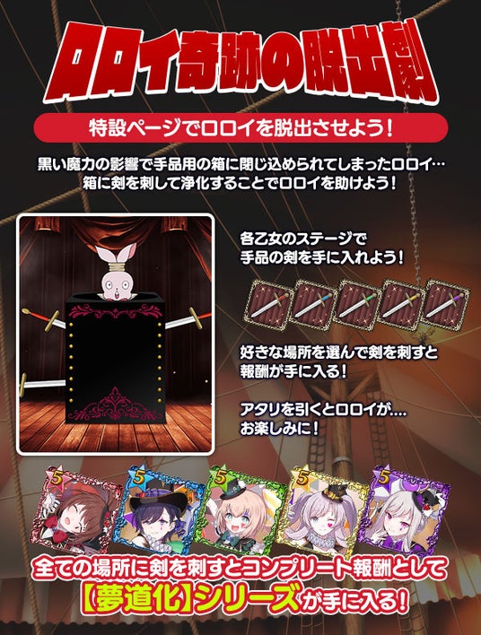 イベントステージを遊ぶと獲得できるイベントアイテム「観客(乙女編)」を集めることによって、サーカス衣装の【道化】シリーズの5乙女が手に入ります。