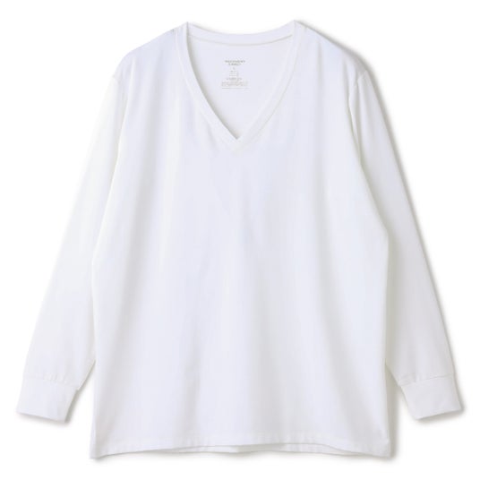 Vネック部分は本体と同じ生地を二重に折り返して縫い付けることにより襟まわりの段差が少なく、やや広めに設計しているためビジネスシャツはもちろん、Tシャツのインナーとしてもご着用いただけることも特長です。