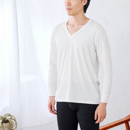 本商品はインナータイプのため、外出やお仕事、おうち時間や就寝時間等、シーンを選ばず日常のあらゆるシーンで疲労回復をサポートします。Vネック部分は本体と同じ生地を二重に折り返して縫い付けることにより襟まわりの段差が少なく、やや広めに設計しているためビジネスシャツはもちろん、