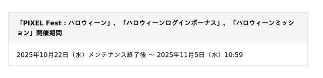 「PIXEL Fest」はさまざまなイベントやステージを遊んでイベント専用の「PFポイント」を集め、集めた「PFポイント」と豪華報酬を交換できるイベントです。本日より開催される「PIXEL Fest:ハロウィーン」では、キャラクター育成素材のほか、ハロウィーン記念シールや新たなアバターアイテムなどを獲得できます。あわせて「ハロウィーンログインボーナス」、「ハロウィーンミッション」も開催いたします。