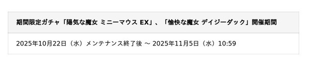 ハロウィーンモチーフの新キャラクター「陽気な魔女 ミニーマウス EX」、「愉快な魔女 デイジーダック」がラインナップされた期間限定ガチャを開催いたします。どちらのキャラクターも、バトルでの活躍はもちろん期間中に開催するイベントに連れて行くとボーナスがつき、ポイントを集めやすくなります。かわいらしいモーションの数々にもぜひご注目ください。