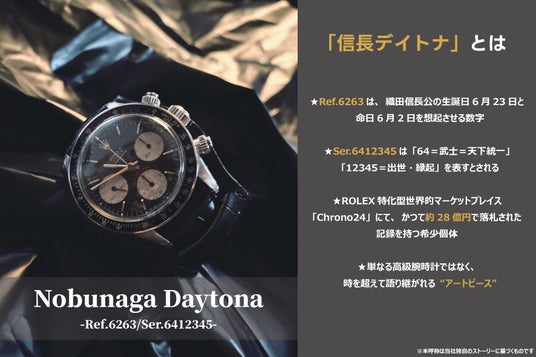 本プロジェクトは、1970年代に製造されたROLEX DAYTONA Ref.6263/Ser.6412345、通称「信長デイトナ」を軸に、腕時計の魅力を共有し、時計を愛する方々が自由に交流できるオンラインコミュニティを形成するものです。