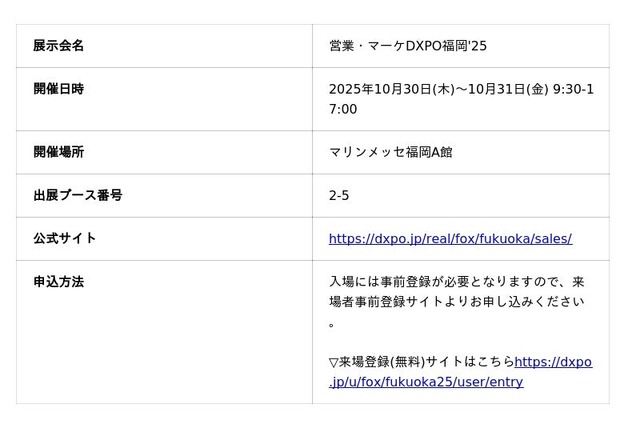 株式会社Mico(本社:大阪市北区、代表取締役社長:山田 修)は、2025年10月30日(木)~31日(金)の2日間、マリンメッセ福岡で開催される「営業・マーケDXPO福岡'25」に出展いたします。