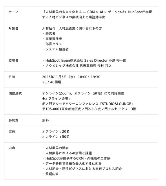 HubSpot Japan株式会社(本社:東京都千代田区、代表:キャサリン ビューカー、以下「HubSpot社」)と、企業のマーケティング活動を支援するナウビレッジ株式会社(本社:東京都港区、代表取締役社長:今村 邦之、以下 「ナウビレッジ」)は、この度、人材業界向けセミナー「人材業界の未来を変える ― CRM × AI × データ分析」を2025年11月5日(水)に開催いたします。