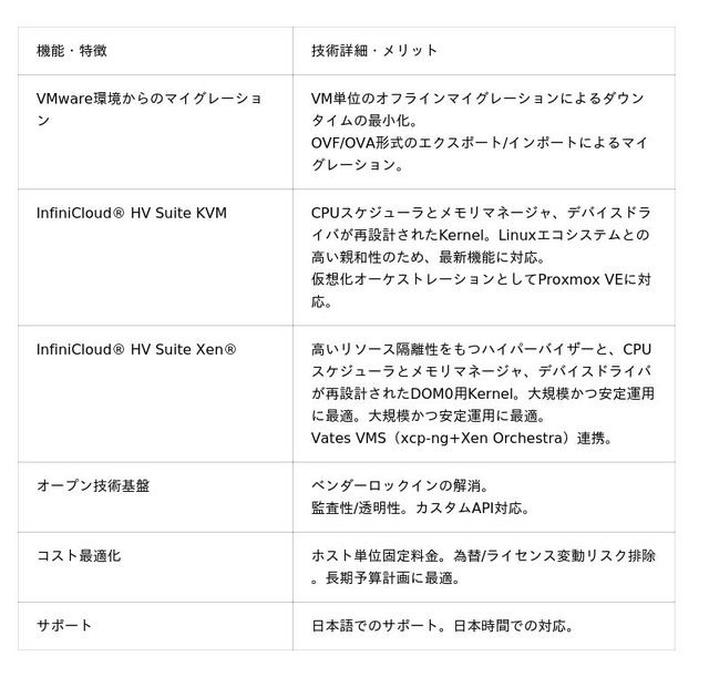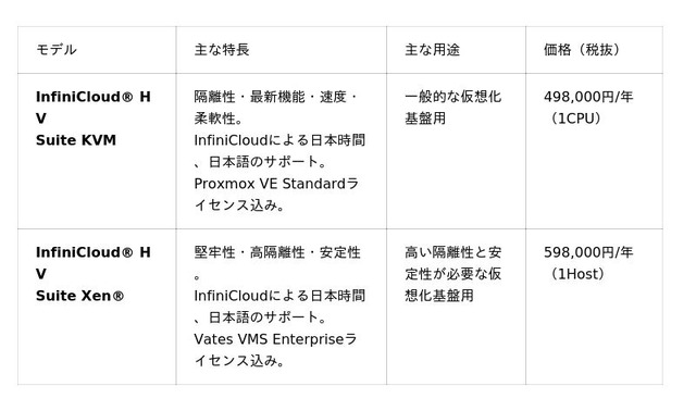 InfiniCloud(R) HV Suite」は、ハイパーバイザーである InfiniCloud(R) HV に加え、対応する人気の仮想化オーケストレーションソフトウェア製品「Proxmox VE」と「Vates VMS」のいずれかをセットにし、日本語サポートを加えて販売するものです。