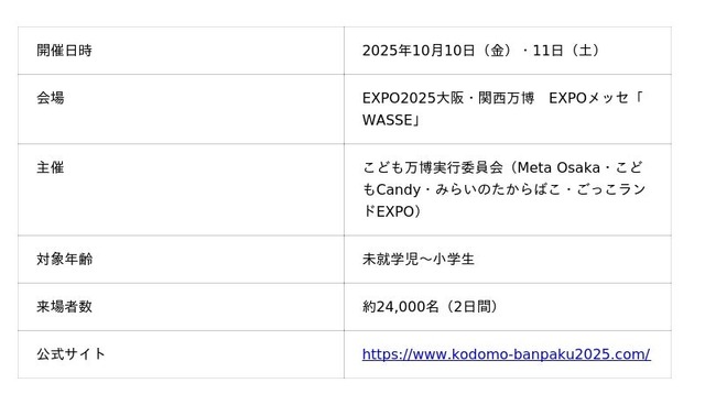 ※「未来のトビラをひらく『こども万博』」は株式会社Meta Osaka(こどもCandy)、株式会社ママそら(みらいのたからばこ)、株式会社キッズスター(ごっこらんどEXPO)の3社による共創プロジェクトとして開催。