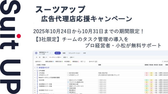 株式会社スーツ(所在地:東京都千代田区、代表取締役社長CEO:小松 裕介)は、チームのタスク管理・プロジェクト管理ツール「スーツアップ」において、広告代理店応援キャンペーンを実施いたします。