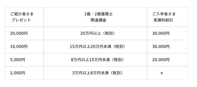 紹介いただいた方が1級・2級建築士(学科・設計製図)関連講座にご入学すると、ご紹介者さま・ご入学者さまのどちらにもうれしいプレゼント!