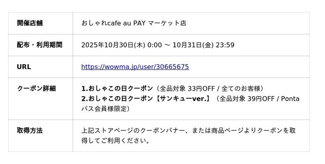 おしゃれcafe au PAY マーケット店 おしゃこの日クーポン配布!