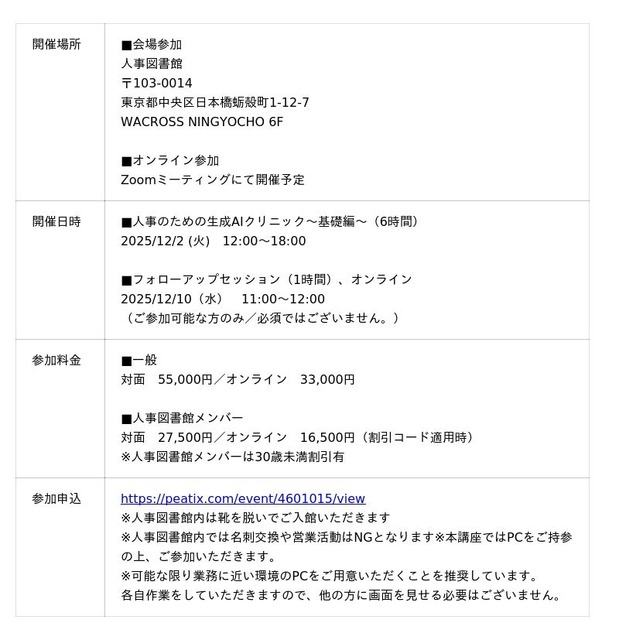 株式会社Trustyyle(本社:東京都中央区・代表取締役:吉田洋介)は、運営するコミュニティ「人事図書館」主催にて、「人事のための生成AIクリニック~基礎編~」を開催いたします。本講座は、対面&オンラインでのハイブリッド開催となります。