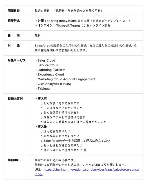 Salesforceのパートナーとして、多くの支援実績を持つSharing Innovationsでは、「これからSalesforce製品を導入する」、または「すでに導入したけど活用しきれていない」、「他のシステムと連携したい」といったお客様のちょっとした相談や質問に無料でお答えする、「Salesforceなんでも相談会」を開設することで、Salesforce製品のより一層の活用を支援するのが目的です。