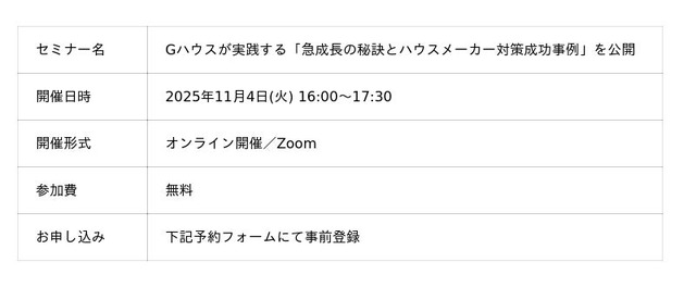 本ウェビナーでは、著しい成長を遂げてきたGハウスの経営ノウハウを公開し、これからの厳しい市場環境下で住宅業界を勝ち抜くための経営戦略・施策についても具体的に解説いたします。
