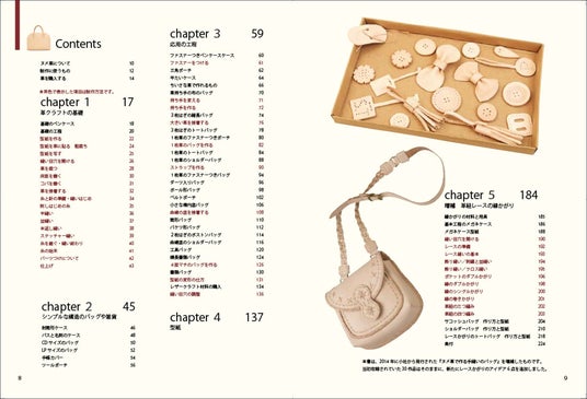 ◎introduction ヌメ革とは/ヌメ革の種類/皮の特長/基本用具/革にまつわる用語解説 ◎chapter1 革クラフトの基礎(基礎の工程→型紙を作る→粗裁ちする→本裁ちする→床面&コバを磨く→接着する→糸と針の準備→縫い始め&刺し始め→平縫い→並み縫い→本返し縫い→ステッチャー縫い→糸を継ぐ&縫い終わり→糸の始末→パーツ付け→仕上げ ◎chapter2 シンプルな構造のバッグや雑貨(封筒形ケース/パスケース/2枚仕立てバッグ/手帳カバー など) ◎chapter3 応用の工程(ファスナー付きケース/三角ポーチ/平たいケース/トグルと持ち手/3枚はぎのバッグ/1枚仕立てのトートバッグ/1枚仕立てのショルダー/1枚仕立てのファスナー付きバッグ/ダーツ入りバッグ/ボール形バッグ/ベルトポーチ/ボストン/筒形バッグ/バケツ形バッグ/2枚はぎのボストン/曲線底のバッグ/工具バッグ/書類バッグ など) ◎chapter4 型紙◎chapter5 縁かがりの材料と用具/基本工程のメガネケース/メガネケース型紙/縫い目穴を開ける/レースの準備/レース縫いの基本/飾り縫い 飾り縫い刺繍と並縫い/飾り縫い 飾り縫いクロス縫い/ポケットのダブルかがり/縁のダブルかがり/縁のシングルかがり/縁の巻きかがり/革紐の三つ編み/革紐の四つ編み/サコッシュバッグ 作り方と型紙/ショルダーバッグ 作り方と型紙/レースかがりのトートバッグ 作り方と型紙