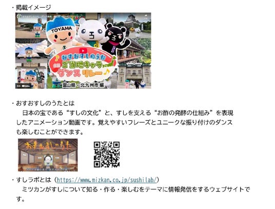 食品メーカー の(株)Mizkan(以下、ミツカン)の「おすおすしのうた 全国ご当地キャラダンスリレー」動画を、すしのブランディングで連携している北九州市と富山県とのコラボレーションバージョンで制作してもらいました!ミツカンのすしに関する情報発信サイト「すしラボ」内で10月31日(金)から公開です!両地域のご当地キャラクターが、曲に合わせてダンスやお散歩をします!北九州市からは、ていたん&ブラックていたんが参加!友情出演も?!
