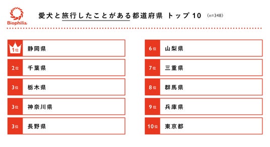 - 愛犬と行った旅行先ランキング、1位:静岡県、2位:千葉県、3位:栃木県