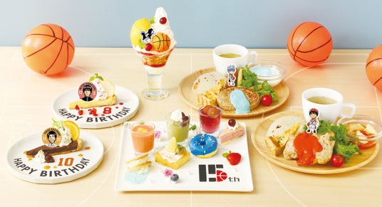 「黒子のバスケ 15th ANNIVERSARY EXHIBITION -OVERTIME-」開催を記念し、名古屋会場限定のコラボレーションメニューを提供するカフェを同時開催!展覧会ビジュアルの7人をフード、デザート、ドリンクでそれぞれ表現したメニューの他、誠凛高校をイメージしたパフェ、名古屋の会期中に誕生日を迎える高尾和成、水戸部凛之助のバースディBirthdayケーキタルトもご用意いたしました。