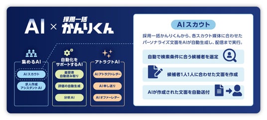 そしてこの度、これらの課題解決を次のステージへと進めるべく、AI機能群を「集めるAI」「自動化をサポートするAI」「アトラクトAI」の3カテゴリに体系化し、『採用一括かんりくん』は採用担当者の右腕となる「採用AIエージェント」へと進化します。このアップデートにより、母集団形成、リソース不足、魅力付けという3つの壁を打ち破り、採用の全フェーズに寄り添う高度なサポートを提供してまいります。