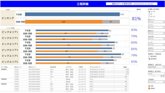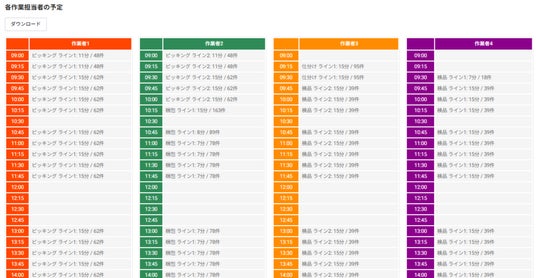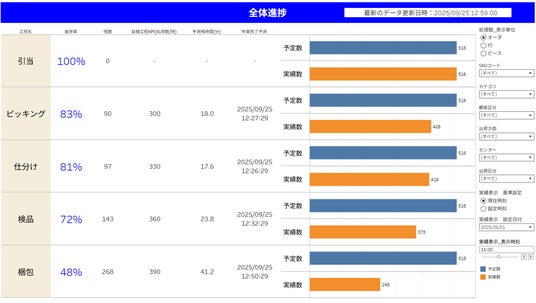 作業工程ごとに日々の出荷数に基づく進捗状況を確認でき、当日の作業進捗に応じた完了時刻を予測します。