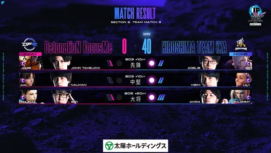 大将戦は「GO1選手」と「あきら選手」の対戦カードに。今節でも「あきら選手」の代名詞ともいえる「攻めと攻めと攻め」の展開により2BATTLEを連取、「GO1選手」を追い詰める。「GO1選手」も大きな読み合いを制し1BATTLEを取り返すも、「あきら選手」の攻めは止まらなかった。第4BATTLEの第2ROUND、画面端の「GO1選手」に対し、「ドライブラッシュ」から「OD フェイタルレッグツイスター」が炸裂、そのままコンボを完走しK.O.。1-3で「あきら選手」が勝利した。