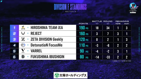 「0-40」で「広島 TEAM iXA」が勝利しポイントランキングも首位を維持。次節からのAWAY3連戦でのパフォーマンスにも注目したい。