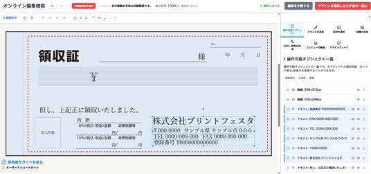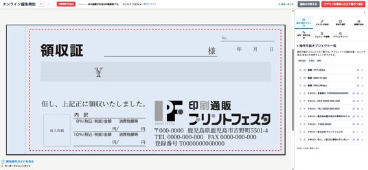 プリントフェスタの「カンタン領収書印刷コーナー」は、ブラウザ上で直感的に操作できるデザインツールです。マウスでクリック・ドラッグするだけで、文字の配置や画像の挿入が可能。専門知識は一切不要です。