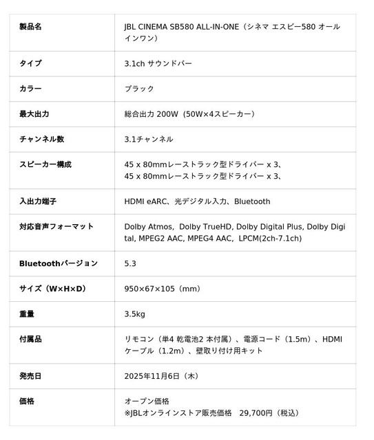シンプル設計でありながら、音の深みと臨場感は本格派。「JBL CINEMA SB580 ALL-IN-ONE」でいつものリビングが、“プライベートシアター”に変わります。