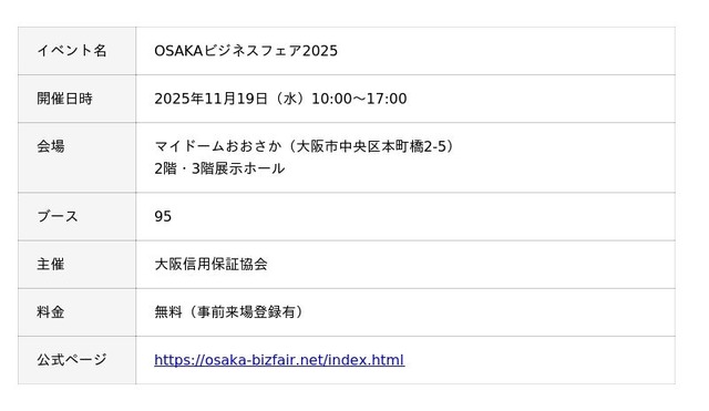 APPLE TREE株式会社(所在地:大阪府大阪市、代表取締役社長:朴 秀明)は2025年11月19日(水)にマイドームおおさか(大阪市中央区)で開催される「OSAKAビジネスフェア2025」に出展いたします。