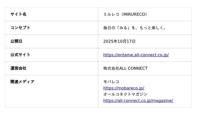 通信インフラ事業と地域振興事業を手掛ける株式会社ALL CONNECT(代表取締役社長:岩井 宏太/本社:福井県福井市)は、映画・ドラマ・アニメなどの動画配信サービス(VOD)に関する情報を発信する新メディア『ミルレコ(MIRURECO)』を2025年10月に公開しました。