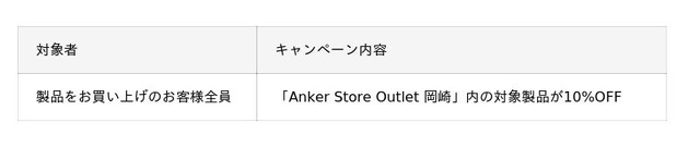 この度オープンを記念し、2025年11月4日(火)~ 2025年11月9日(日)の6日間限定で「Anker Store Outlet 岡崎」内の対象製品を10%OFFでご購入いただけるキャンペーンを実施します。