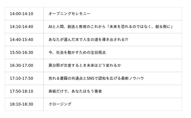 最大の注目は、参議院選挙当選後、初登壇となるベストセラー著者の安野貴博氏の登場です。安野氏は、AI・教育・社会を舞台に、“言葉を現実化させる人”として、政治の最前線に立ち続け、著書『1%の革命』で描かれた未来像を、今、法律と社会というリアルな場で動かしています。さらに、演説、出版、編集のプロフェッショナル、「編集&演説の名手/空気を変える達人」として、安野氏の奥様である黒岩里奈氏や、ベストセラー『1分で話せ』でも知られる、パブロスが選ぶ「読書会大賞-2025秋」で第1位となった『努力革命』著者の伊藤羊一氏も登壇します。各講演やパネル討議に加え、「著者表紙ワーク」なども行ない、参加者の“言葉を社会に届ける”行動の背中を押していきます。