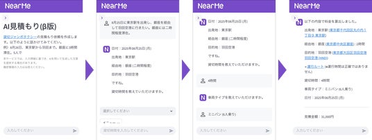 このたび、AI技術の積極的な活用を体現する取り組みとして、エアポートシャトルなど、ニアミーが提供するサービスの中から、まずは貸切送迎サービスである『貸切ジャンボタクシー』にAIエージェントを活用した予約機能の搭載を始めました。具体的には、AIエージェントを活用し『貸切ジャンボタクシー』サービスを利用するにあたって必要な、日時や使用時間、経路をAIエージェントへ自然なやりとりによって入力するだけでサービスの予約や利用が簡単にできます。