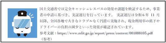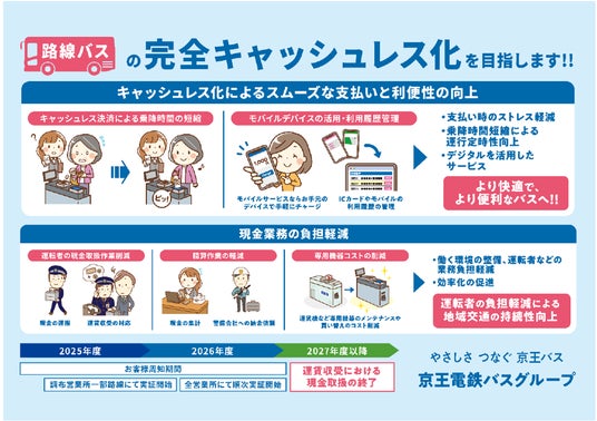 バス車内での現金でのご利用は、運転者の現金取扱や現金管理の対応が必要となっており、バスの『完全キャッシュレス化』は、運転者の業務負担軽減の観点において、業界全体での課題でもある人材不足への対応とバス事業維持に向けた運用効率化の一助となることが期待できます。また、スムーズな運賃支払いによって、乗降時間が短縮しバス運行の定時性が向上することや、デジタルでの利用履歴管理、モバイルデバイスを活用したサービスなど、お客様の利便性向上に寄与できるものと考えております。