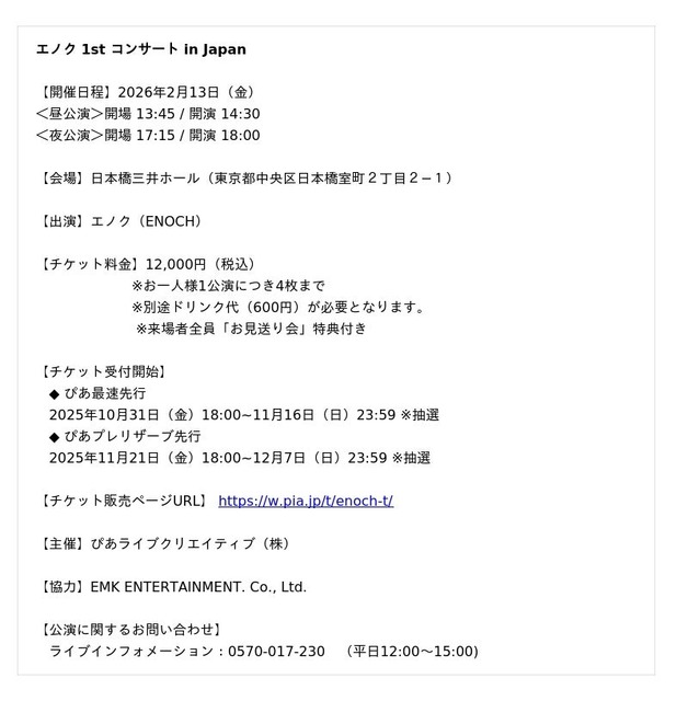 そんな彼が、2026年2月13日(金)、日本橋三井ホールで日本初の単独公演『エノク 1st コンサート in Japan』を開催する。その前の11月1日(土)には『現役歌王 ALLSTAR DREAM MATCH』出演のために来日する予定。日本でのステージが続く、充実のシーズンになりそうだ。