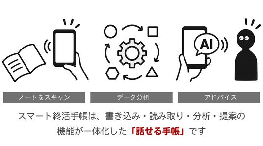 スマート終活手帳はノートへの書き込みやチェックリストを読み取ってアドバイスをお届けする「AIコンシェルジュ」機能と連携します。つまりスマート終活手帳は、ノートを使えば使うほど有意義なアドバイスが手元に届く画期的なサービスであり、「なにをすればいいかわからない」という終活最大の問題をAIと一緒に解決する日本初の「話せる手帳」なのです。
