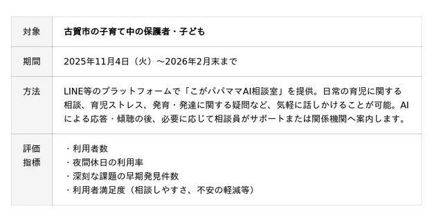 つながりAI株式会社(東京都港区、代表取締役:駒崎弘樹)は、古賀市と連携し、2025年11月4日より保護者と子どもを対象とした相談AI「こが パパママ子どもAI相談室」の実証実験を開始します。