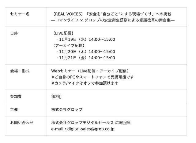 安全衛生活動を推進する皆さまにとって、現場の意識変化を生み出すプロセスを学べる貴重な機会です。ぜひご参加ください。