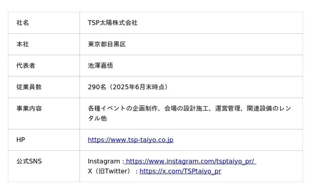 2025年で設立70周年を迎えたTSP太陽株式会社は、空間ソリューションによるイベントコンサルティングから企画・制作まで、あらゆる感動の場を一気通貫した支援で創造するプロフェッショナル集団です。国際的なビッグイベントを始め、あらゆるイベントに携わるデザイン・コンサルティング会社として、収益の最大化を図る事前収支計画から企画・クリエイティブ制作・建築設計・施工・運営までをトータルソリューションとして提供しています。PR・プロモーション・イベントに付随するホスピタリティサービスもお任せください。近年では、豊富な経験から培われた独自のノウハウを駆使し、ダイバーシティやSDGs・ESGへの取り組みを積極的に推進しています。