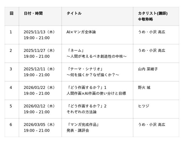 - 名称:創造性ゼミ「AI×マンガ ゼミ ~誰もがマンガを生成できる時代に、アナタは何を描きたいのか?描くのか?~」- 期間:全6回(各 19:00-21:00、木曜開催)