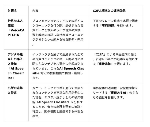 イレブンラボ独自の高度な3つの安全対策と「C2PA標準」の融合